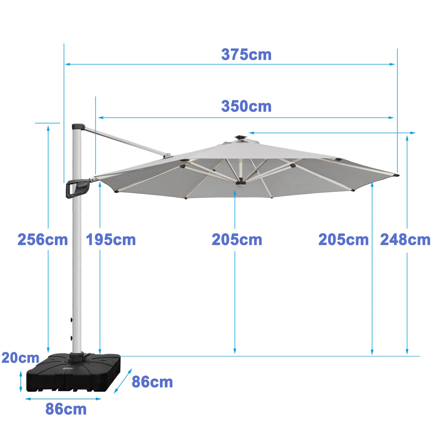 Genießen Sie gemütliche Abende im Freien mit dem RANSENERS Ampelschirm mit LED (Modell AMR350ASOLAR). Dieser hochwertige Marktschirm bietet nicht nur optimalen Sonnenschutz, sondern auch eine integrierte LED-Beleuchtung, die Ihre Terrasse, Ihren Garten oder die Gastronomiefläche stilvoll in Szene setzt.