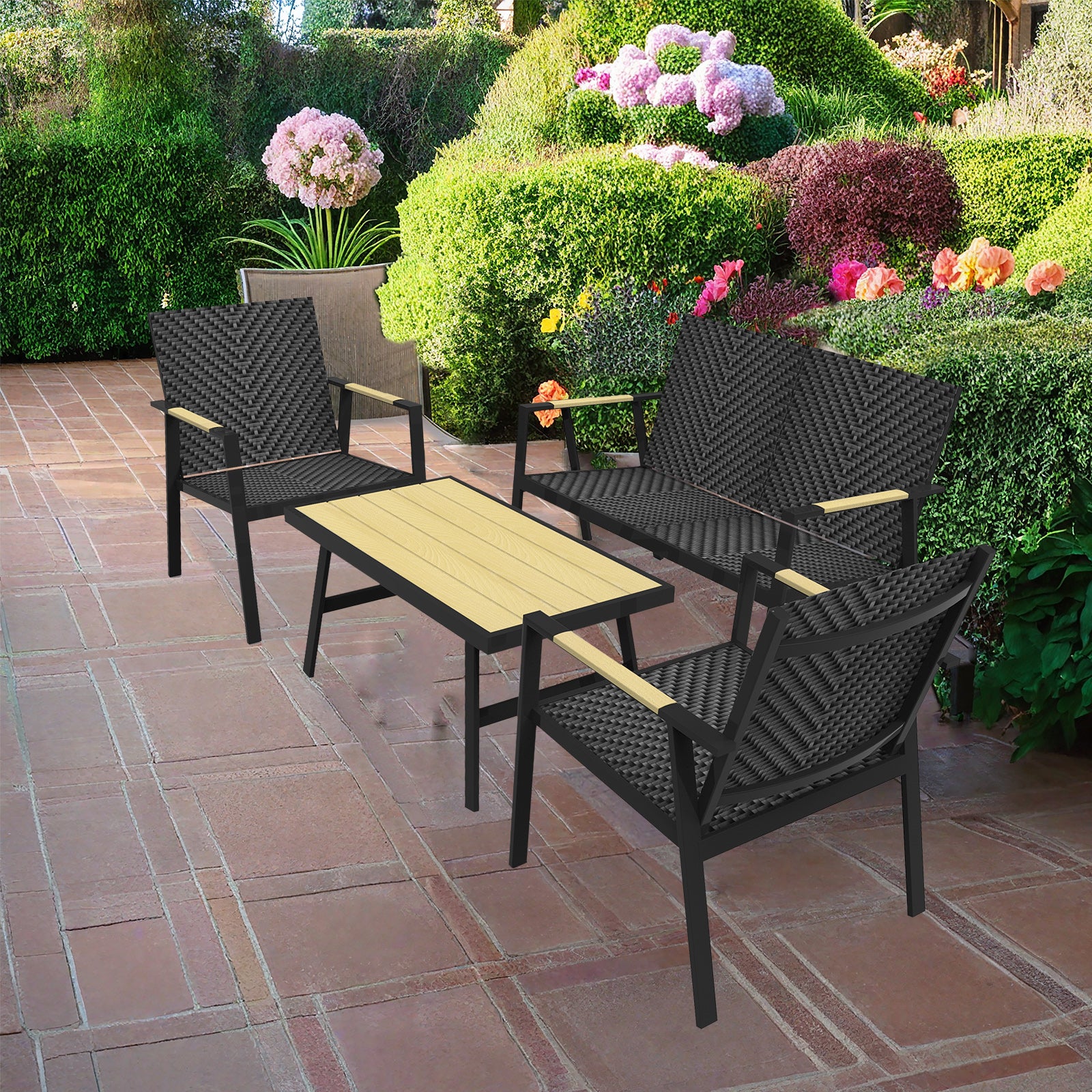 RANSENERS (Outlet) Premium 4tlg-Set Gartenmöbelset mit Vollemaluminium Rahmen und Polyrattan Sitzfläche für Garten Terrasse und Balkon (Schwarz)